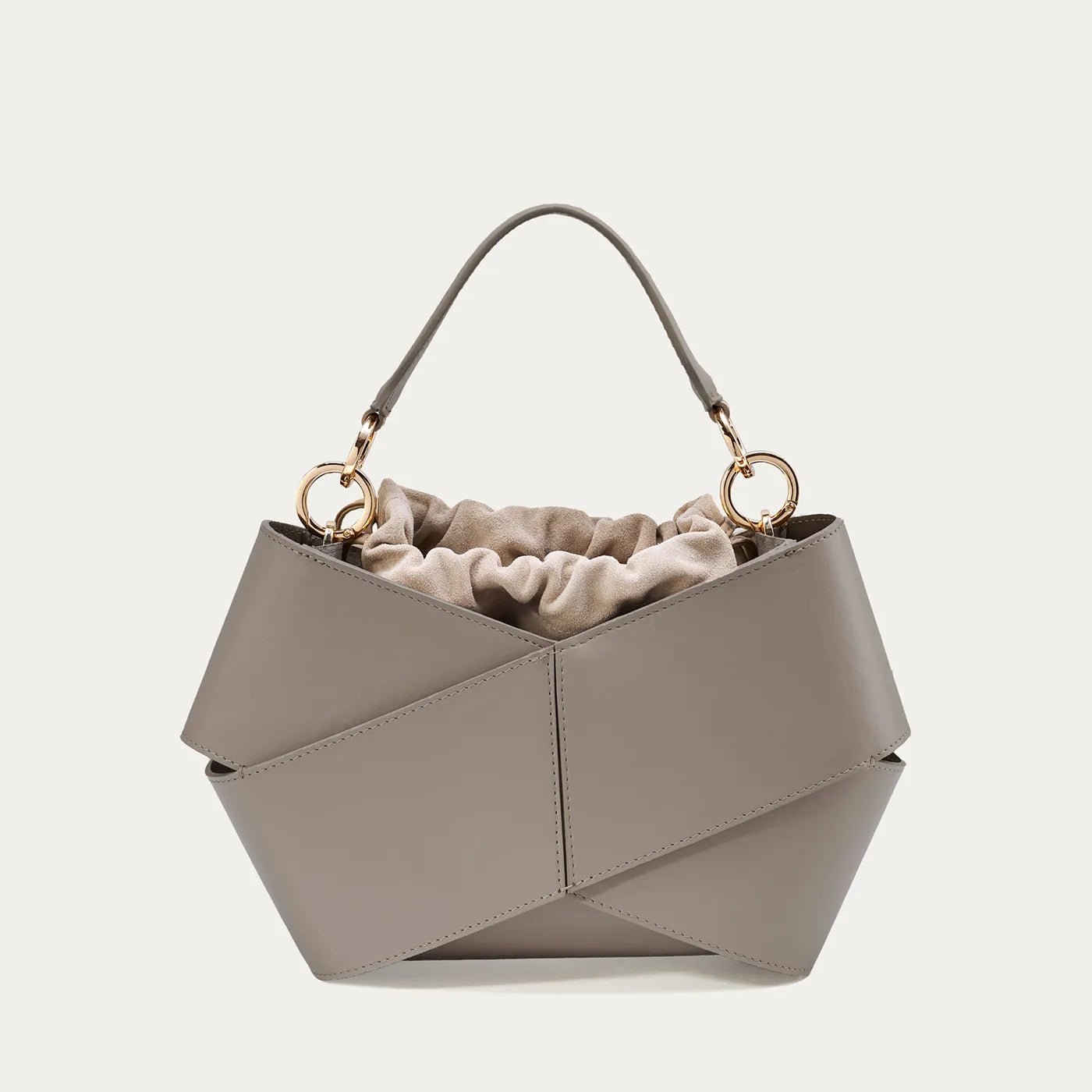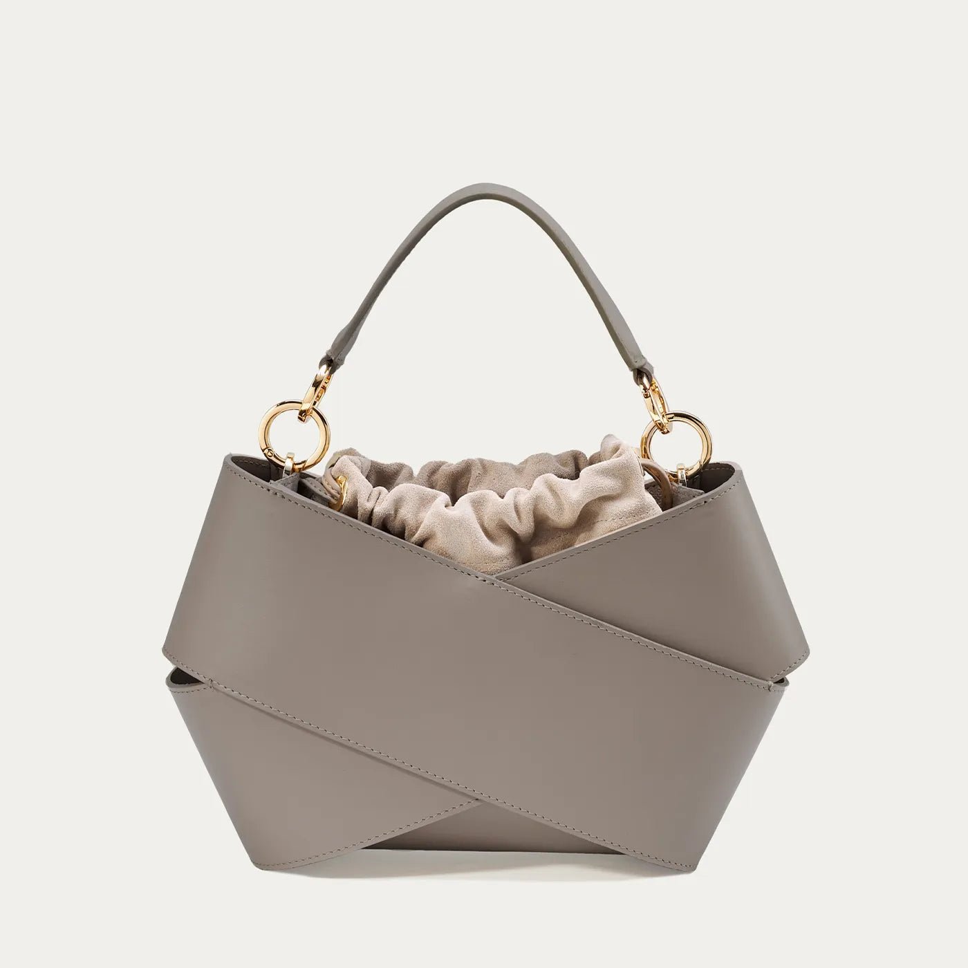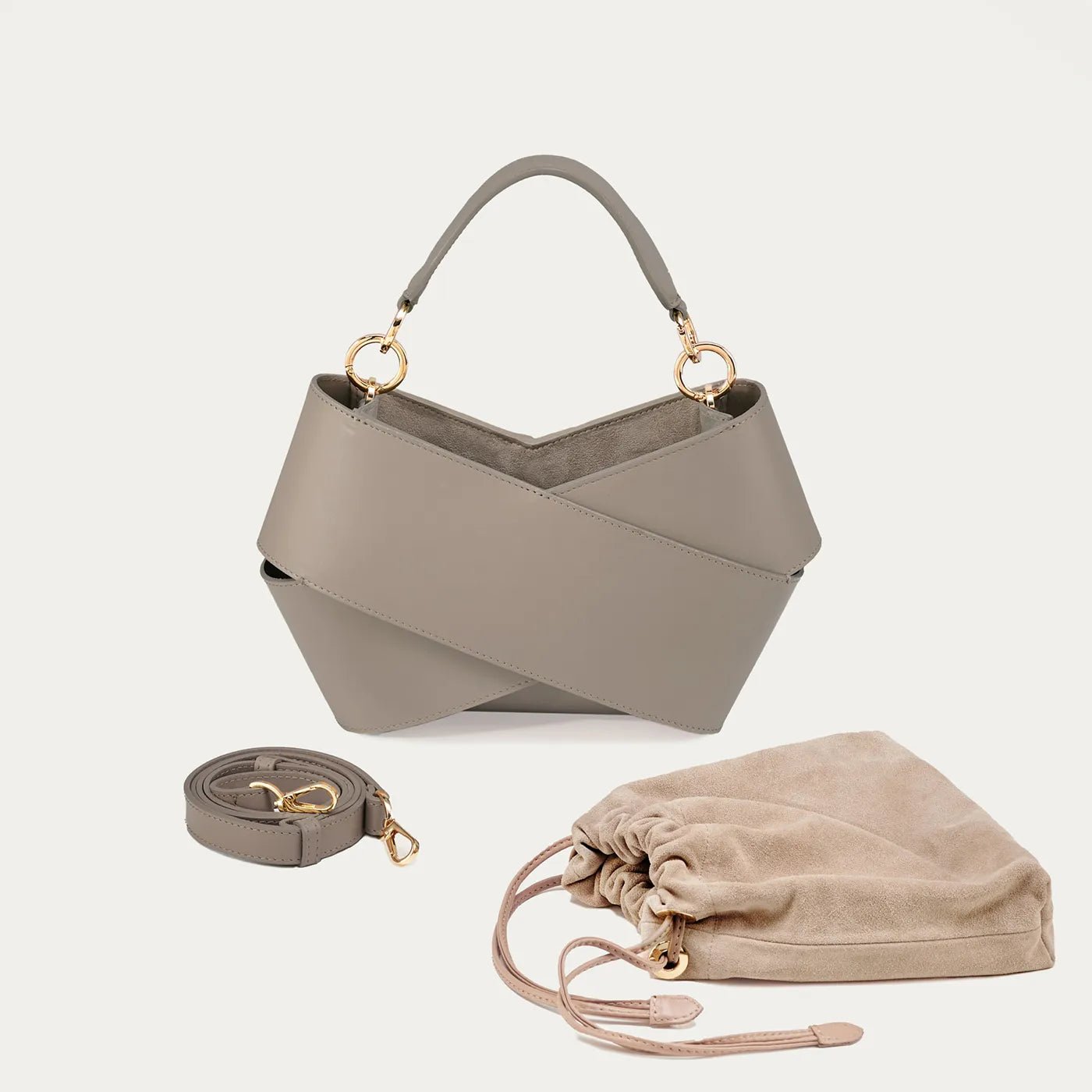 Forma torby. stworzona z dwóch kawałków skóry owiniętych wokół siebie. przyciąga uwagę swoim nowoczesnym wyglądem. W jej wnętrzu znajduje się luzem umieszczony woreczek. który skutecznie zabezpiecza zawartość przed przypadkowym wypadnięciem. Co więcej. woreczek można łatwo wymieniać. co pozwala na personalizację torby i nadanie jej nowego charakteru. Torba wyposażona jest w pasek na ramię. który zapewnia wygodę noszenia. oraz elegancką rączkę ze złotymi okuciami. Jest elegancka ale i praktyczna